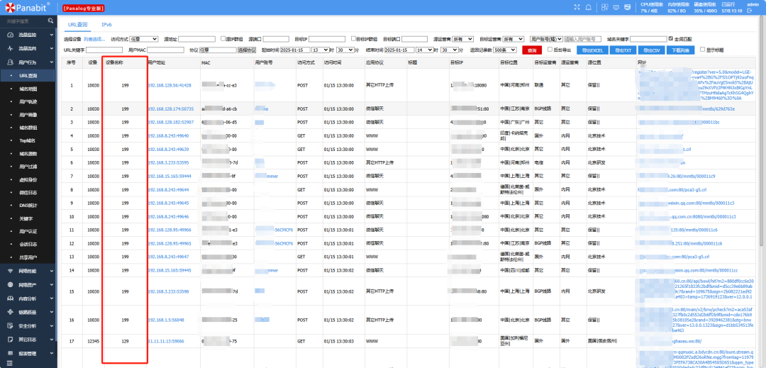 当Panalog对接了多台Panabit设备进行查询时,光看设备ID,很难分辨出具体是哪台设备产生的日志。 新版本中,Panalog在URL查询、DNS统计、会话日志中直接显示设备名称,设备信息一目了然,不用再翻来覆去地查询确认啦~ 设备名称直接显示