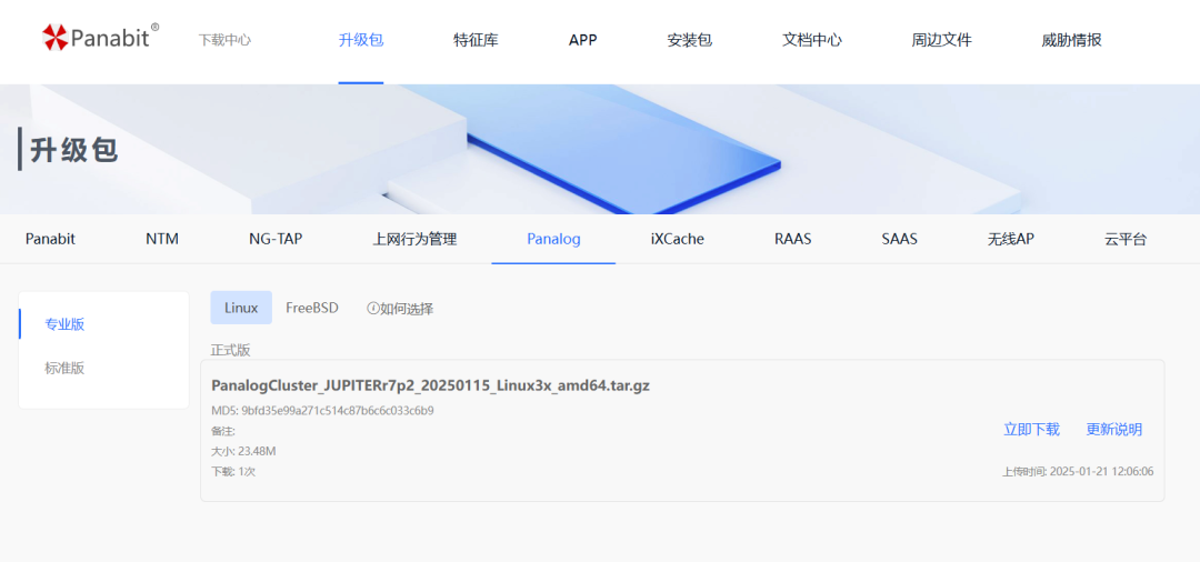 新版本升级包,请访问Panabit官网下载中心获取: https://www.panabit.com/download
