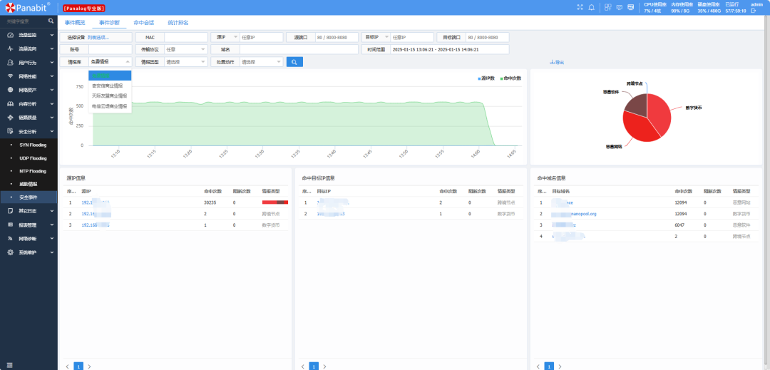 选择情报库进行查询 这个功能可以和Panabit联动,当Panabit上有威胁情报命中时,相关的匹配数据会被推送到Panalog进行存储,方便用户追溯与分析情报匹配的历史记录,让安全管理更加精准和高效。